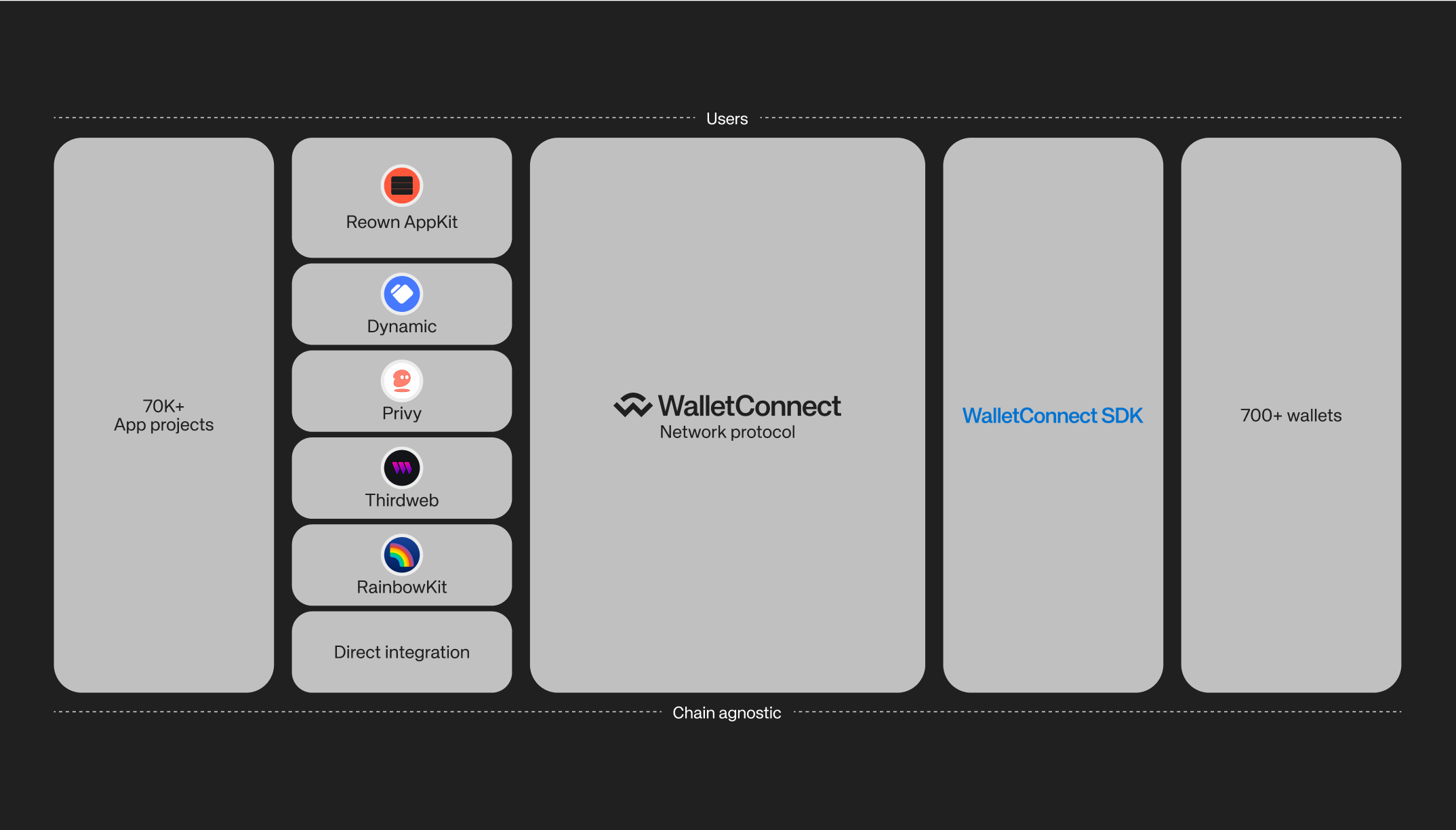 The official gateway to the WalletConnect Network. Integrating gives your app access to 500+ wallets and seamless multichain UX that just works.