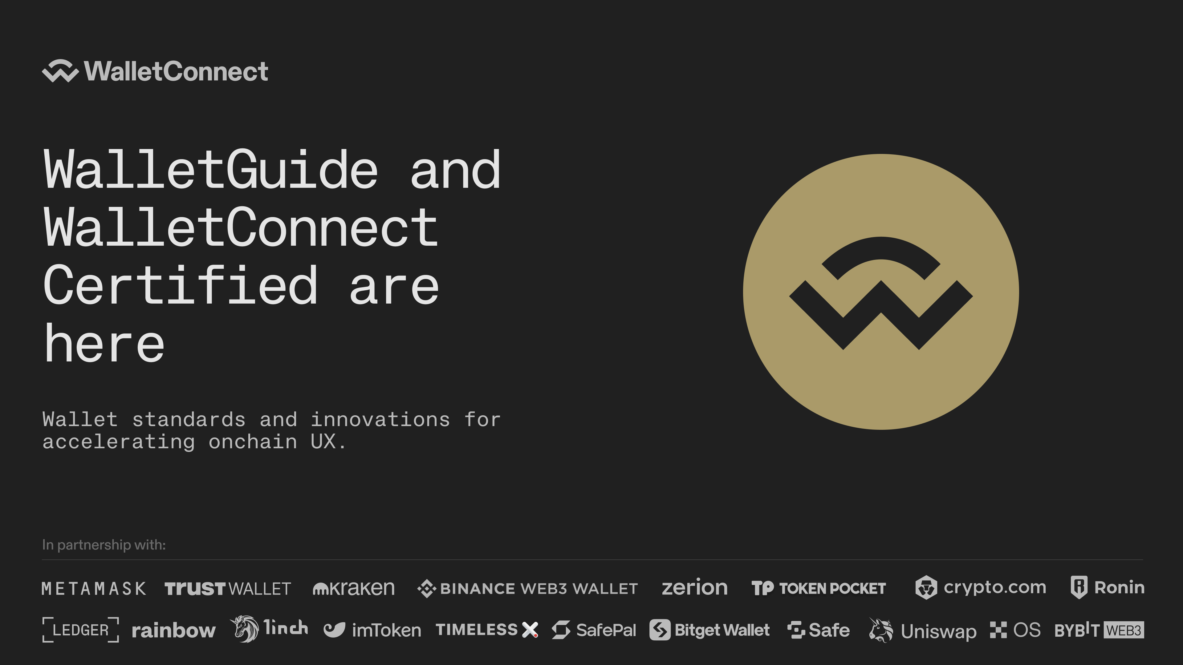WalletConnect Certified includes an impressive cohort of leading wallets, with launch partners over 20 partner has received WalletConnect Certified, including MetaMask, Trust, Binance Wallet, Kraken Wallet, Ledger, SafePal, Rainbow, TokenPocket, Timeless X, Safe, Zerion, 1inch Wallet, Crypto.com, Ronin, OKX Wallet, Bitget Wallet, Uniswap Wallet, Bybit Wallet, and imToken. As a flagship feature within WalletGuide, this certification aligns with WalletConnect’s vision of a seamless, secure wallet experience. WalletGuide users can quickly identify WalletConnect Certified wallets by the “gold tick,” a mark of distinction that signifies the wallet has met the industry’s highest standards.
