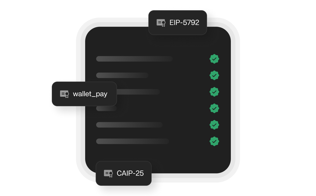 WalletConnect evolves with the ecosystem — supporting new standards like wallet_pay, EIP-5792 and CAIP-25 for batch transactions, cross-chain UX, and polished flows without breaking developer integrations.